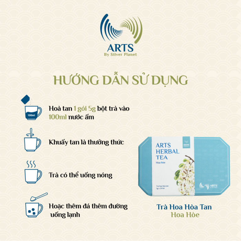 Để tận dụng những lợi ích này, hoa hòe có thể được sử dụng dưới nhiều hình thức khác nhau. Một phổ biến nhất là chế biến nước hoa hòe, hoa hòe khô được ngâm trong nước sôi và dùng như một loại trà hoa thông thường. Bạn cũng có thể sử dụng trà hoa hòa tan Hoa hòe từ nhà ARTS HERBAL TEA với túi nhỏ tiện lợi, có thể mang đi và sử dụng mọi lúc mọi nơi và vẫn có thể nhận được những lợi ích sức khỏe từ chúng.